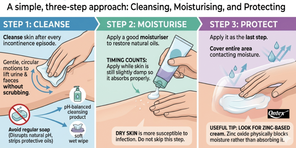 Most carers cleanse and moisturise consistently but skip the barrier cream, and that is where skin becomes exposed. The solution is to apply it as the last step, covering the entire area that comes into contact with moisture.