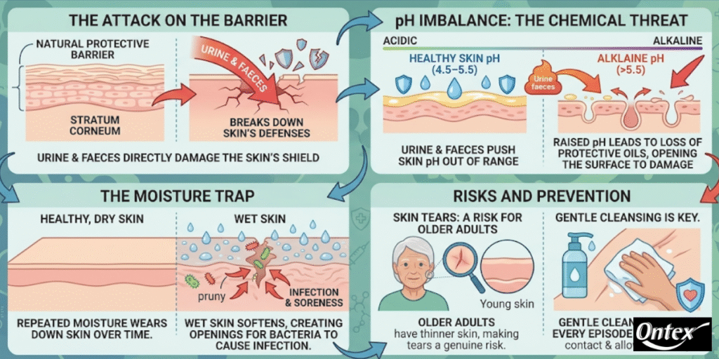 Urine and faeces push skin pH out of its natural range (healthy skin pH sits between 4.5 and 5.5). When pH rises above that range, the skin loses its protective oils and leaves the surface open to damage. That is why cleansing skin gently after every incontinence episode cuts down chemical contact and gives skin a real chance to recover.